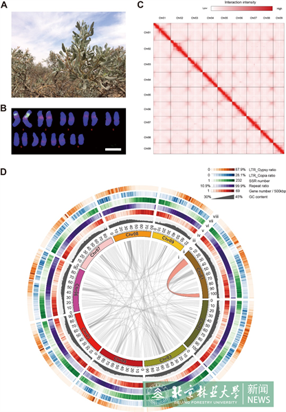 (A) 野外生長的蒙古沙冬青植株(圖片采集于內蒙古阿拉善左旗,2015年7月);(B) 蒙古沙冬青的染色體核型分析;(C) 使用Hi-C三維基因組信息組裝的9條沙冬青染色體;(D) 基因組的注釋和基因組內部的共線性關系。