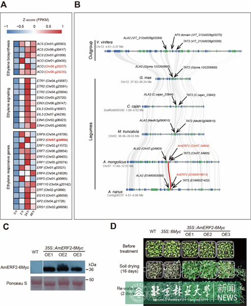 (A) PEG滲透脅迫下乙烯信號通路相關基因的表達水平;(B) 沙冬青AmERF2基因在豆科植物中的進化分析;(C) AmERF2在擬南芥中的過表達及驗證;(D) 擬南芥AmERF2轉基因植物的抗旱性檢測。