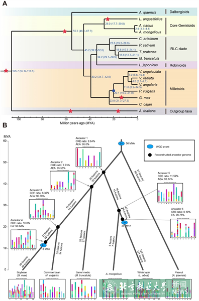(A) 沙冬青與部分豆科植物的系統發生樹,以及物種分化時間的推斷;(B) 沙冬青與其他豆科植物的祖先染色體分析。