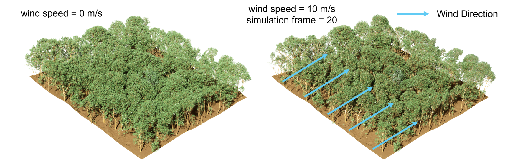 針對以上挑戰(zhàn),RAPID-RTX模型創(chuàng)新性地將物理力場仿真與輻射傳輸計算實時耦合,構(gòu)建了包含場景構(gòu)建、物理仿真、實時輻射傳輸及輸出處理四大核心模塊的建模框架,實現(xiàn)了動態(tài)森林場景的“物理?光學(xué)”一體化真實模擬。本研究定量揭示了無人機陰影(圖1)與風(fēng)場擾動對森林遙感信號的關(guān)鍵影響(圖2),并提出針對性觀測準(zhǔn)則:為規(guī)避陰影干擾,應(yīng)保持傳感器視場角>5°且飛行高度>60米;為減少風(fēng)擾影響,應(yīng)在風(fēng)速低于4米/秒的條件下開展定量觀測。