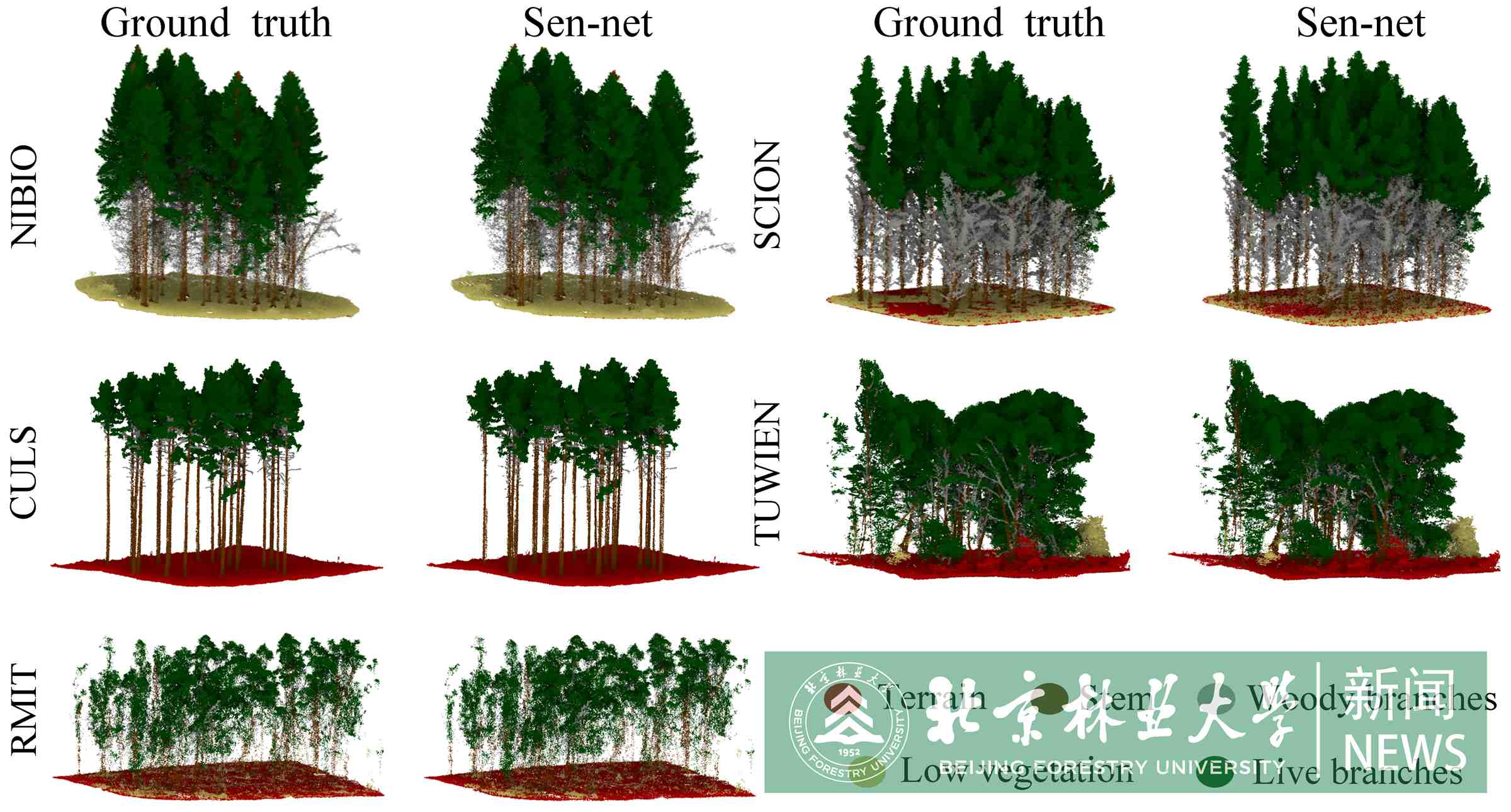 在Lin3D數(shù)據(jù)集上,Sen-net總體正確率、平均交并比分別達(dá)到97.6%和85.1%;在國(guó)際公開(kāi)數(shù)據(jù)集上,總體正確率、平均交并比分別達(dá)到94.5%和78.2%,說(shuō)明Sen-net在準(zhǔn)確性和泛化能力方面表現(xiàn)出色,優(yōu)于同類(lèi)方法。該網(wǎng)絡(luò)無(wú)需調(diào)節(jié)參數(shù),使用方便,泛化能力強(qiáng),適用于森林場(chǎng)景點(diǎn)云分析,并可作為森林場(chǎng)景點(diǎn)云處理算法的基礎(chǔ)性框架,該研究成果表明團(tuán)隊(duì)在這一領(lǐng)域的研究處于國(guó)際前沿水平。