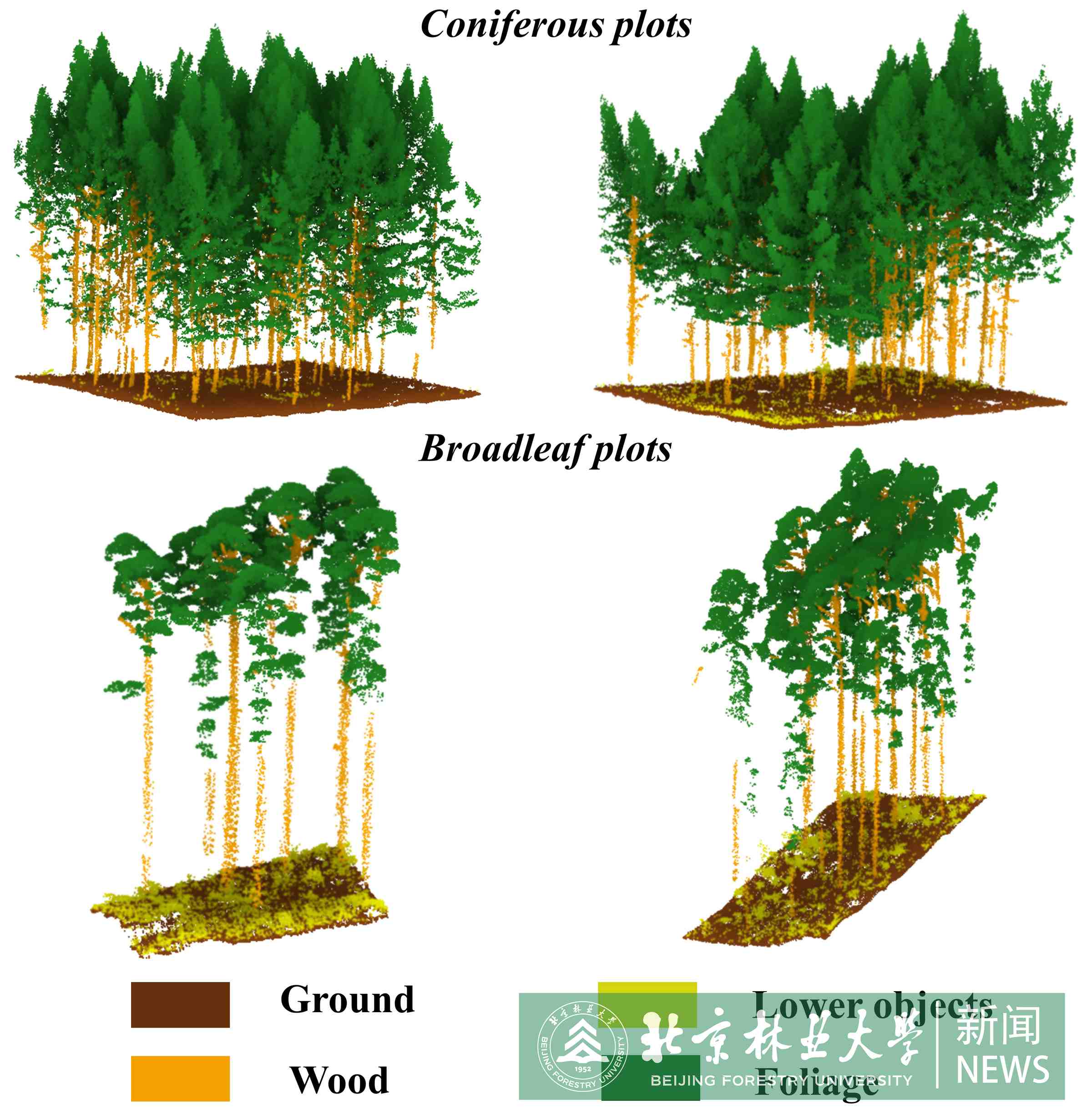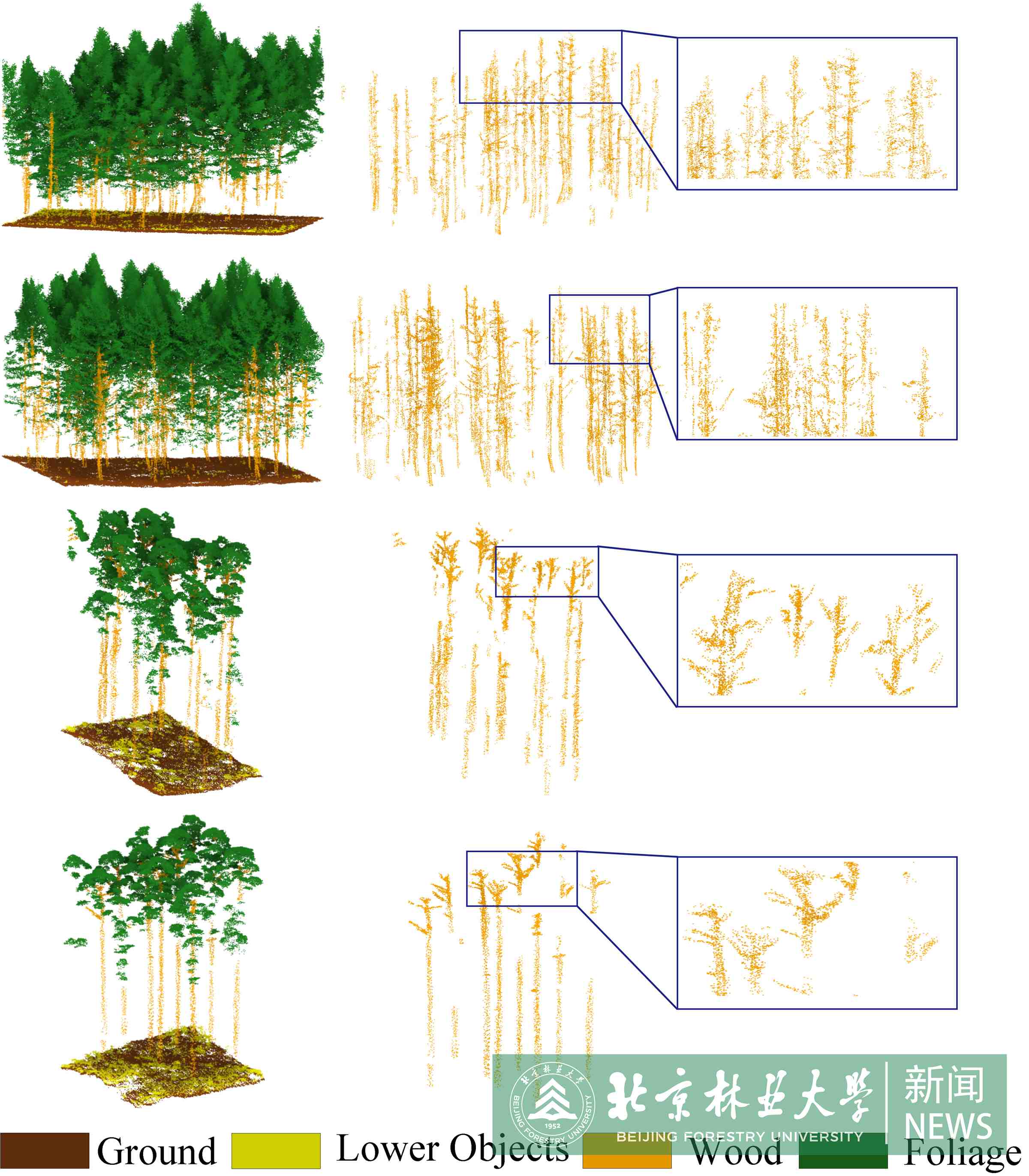 團(tuán)隊(duì)基于長(zhǎng)期在三維點(diǎn)云處理方面的研究,充分發(fā)揮“遙感—林草—AI”學(xué)科交叉融合的優(yōu)勢(shì),發(fā)展了數(shù)據(jù)驅(qū)動(dòng)的深度神經(jīng)網(wǎng)絡(luò)模型,從森林場(chǎng)景三維點(diǎn)云有效分離出樹(shù)葉、木質(zhì)成分、低矮植被及地面。針對(duì)這一目標(biāo):