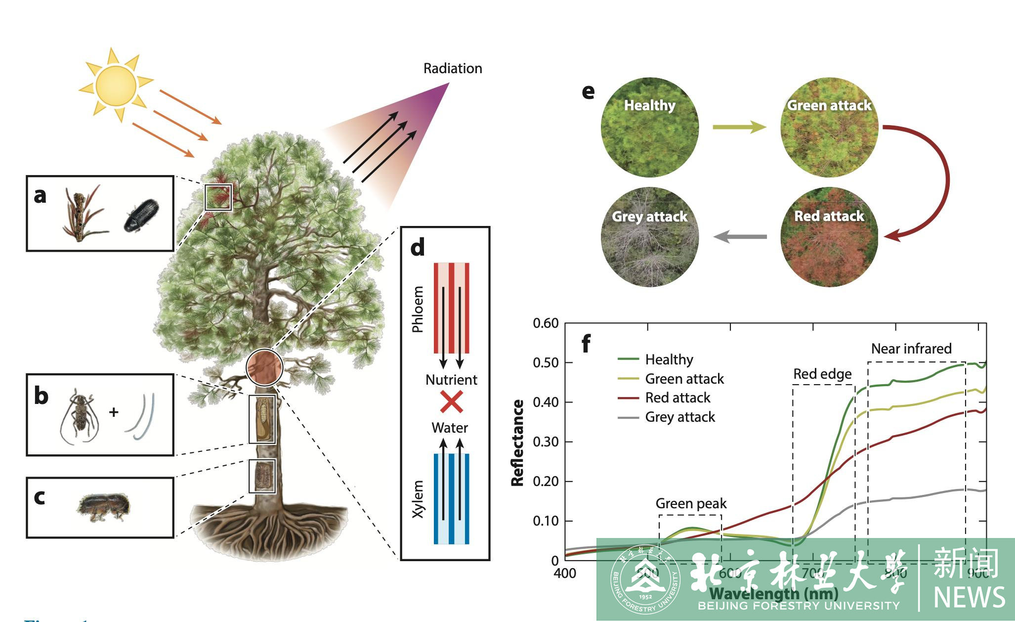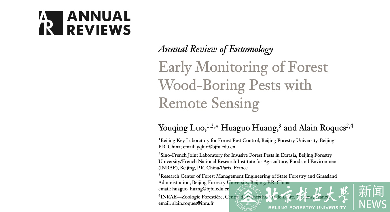 林木鉆蛀性害蟲(chóng)危害隱蔽、癥狀滯后,常規(guī)手段發(fā)現(xiàn)時(shí)往往已連片成災(zāi),但遙感技術(shù)具有實(shí)現(xiàn)林木鉆蛀性害蟲(chóng)早期監(jiān)測(cè)的潛力與可能。北京林業(yè)大學(xué)駱有慶教授研究團(tuán)隊(duì)的論文“Early Monitoring of Forest Wood-Boring Pests with Remote Sensing”,近期已在昆蟲(chóng)學(xué)國(guó)際頂級(jí)期刊《Annual Review of Entomology》(IF="22.682)上在線發(fā)表。
