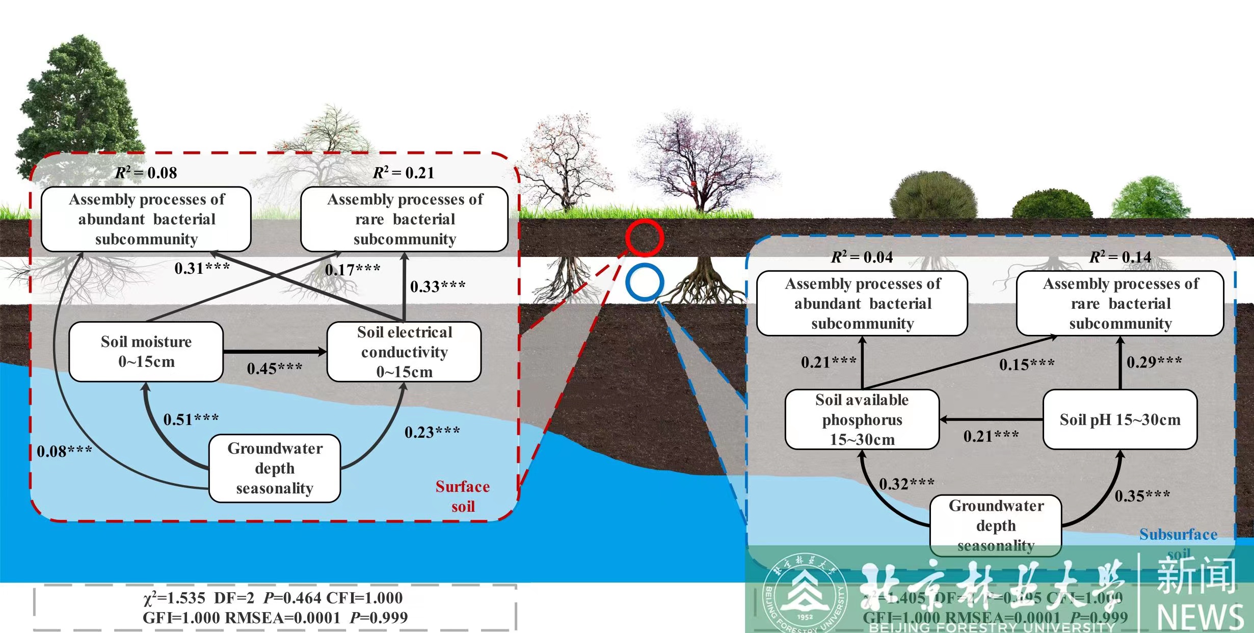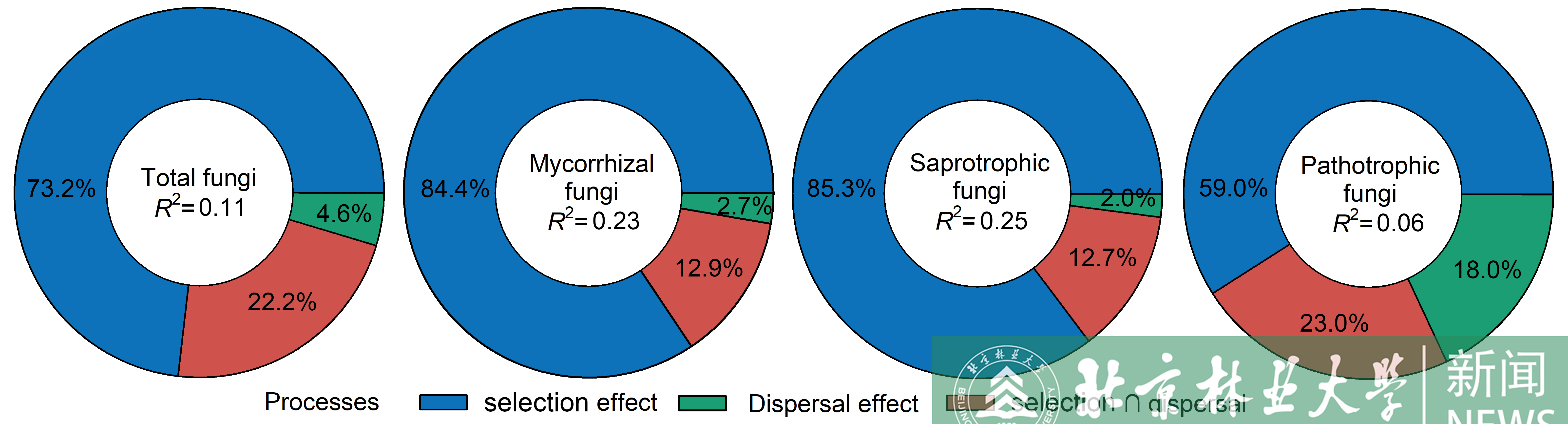 課題組還從地下維度厘清植物功能性狀對土壤真菌功能群構建的影響,發現真菌群落及其功能群的構建過程由確定性過程(異質性選擇)驅動,植物根系性狀是介導真菌群落構建的主要因素。