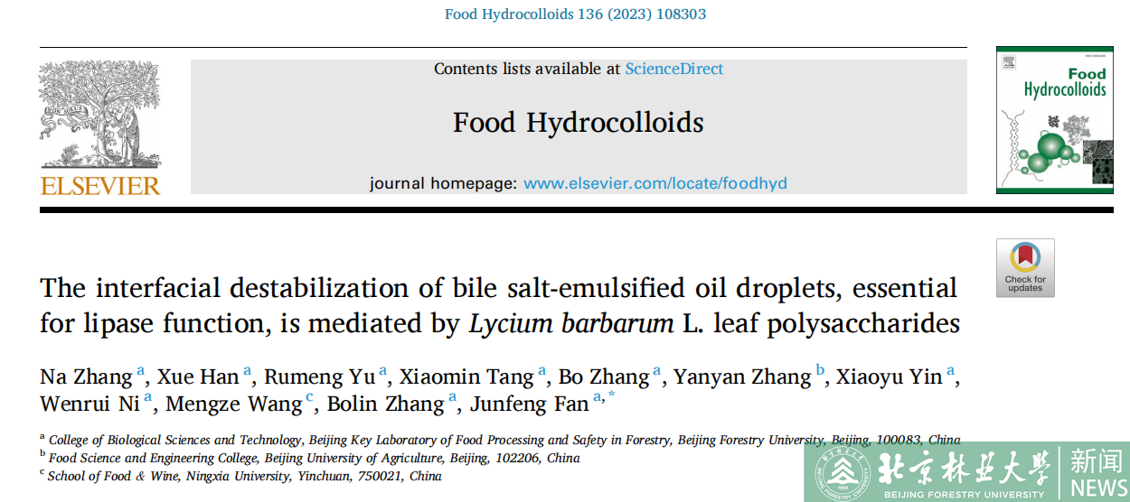 近日,生物科學與技術學院食品學科范俊峰教授團隊在國際食品頂級期刊《Food Hydrocolloids》(IF:11.504)發(fā)表了題為“The interfacial destabilization of bile salt-emulsified oil droplets, essential for lipase function, is mediated by Lycium barbarum L. leaf polysaccharides”的研究論文,以膽酸鹽穩(wěn)定的脂質(zhì)乳液平臺為研究對象,創(chuàng)新性地從界面化學的視角揭示了多糖與腸道分泌的脂質(zhì)消化劑之間的相互作用,為生物活性物質(zhì)抑制脂肪消化的研究奠定了新的理論基礎。