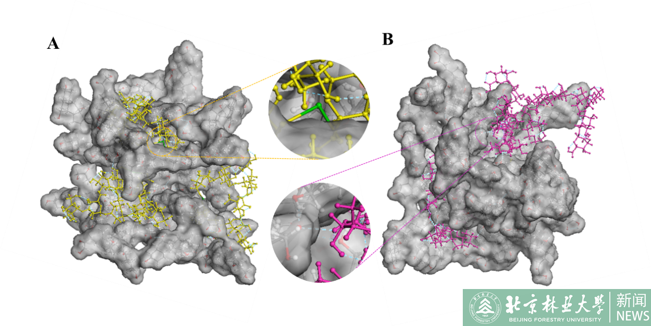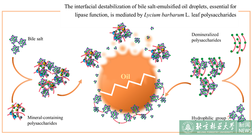 研究發(fā)現(xiàn),枸杞葉多糖可以強烈破壞膽酸鹽穩(wěn)定的乳液,是抑制游離脂肪酸釋放的主要原因。進一步研究發(fā)現(xiàn),枸杞葉多糖中的礦質(zhì)元素對于多糖與膽鹽的結(jié)合有重要影響,多糖對乳液穩(wěn)定性的作用主要是由于多糖中的內(nèi)源性礦物質(zhì)(28%)影響了膽酸鹽與多糖復合物的聚集和兩親性。動力學模擬結(jié)果表明,膽酸鹽與含礦物質(zhì)的多糖的相互作用占據(jù)了膽酸鹽中的疏水位點,提高了復合物的親水性,這是導致結(jié)合物乳化能力降低的根本原因。這些發(fā)現(xiàn)從界面化學的角度為植物源多糖對脂肪消化的影響提供了新的見解,也進一步加深了我們對多糖與腸道分泌的脂質(zhì)消化物相互作用的理解。