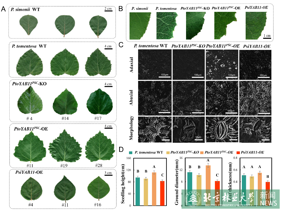 為進(jìn)一步解析PtoYABBY11PSC與PsiYABBY11的分子功能,利用農(nóng)桿菌介導(dǎo)的方法,對(duì)PtoYABBY11PSC與PsiYABBY11進(jìn)行過(guò)量表達(dá),結(jié)果顯示PtoYABBY11PSC-OE植株葉長(zhǎng)、葉寬、葉面積顯著增加,光合作用效率顯著提升,葉片邊緣鋸齒顯著加劇。PtoYABBY11PSC-OE植株葉長(zhǎng)、葉寬、葉面積顯著減小,光合作用效率降低,葉片邊緣光滑,但是葉脈厚度與氣孔密度顯著增加。為進(jìn)一步驗(yàn)證PtoYAB11PSC的功能,研究者利用毛白楊群體基因組數(shù)據(jù),在PtoYAB11PSC僅有的174bp范圍內(nèi)排除SNPs的干擾,設(shè)計(jì)gRNAs,利用Cas9編輯系統(tǒng)實(shí)現(xiàn)了PtoYAB11PSC敲除(PtoYAB11PSC-KO)。PtoYAB11PSC-KO植株顯示葉片邊緣光滑,但是光合作用效率與葉片面積沒(méi)有顯著改變。