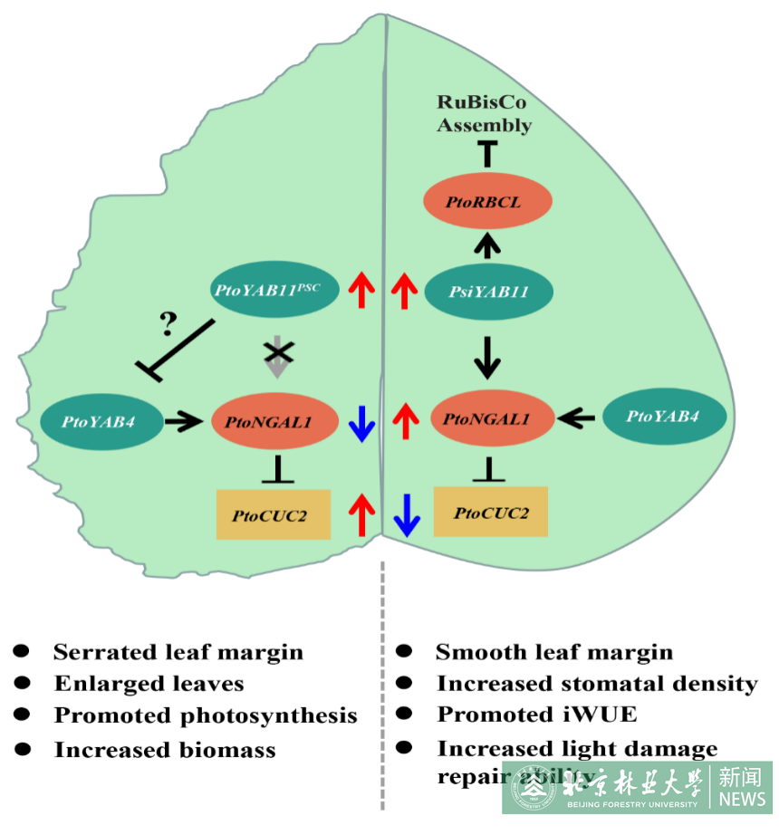 綜合以上研究結(jié)果表明,在楊樹(shù)基因組中,YABBY11通過(guò)反式調(diào)控作用激活NGAL1表達(dá)上調(diào),進(jìn)而抑制CUC2基因表達(dá),調(diào)控光滑葉緣的形態(tài)發(fā)育。同時(shí),YABBY11 激活RBCL基因表達(dá),導(dǎo)致Rubisco大小鏈裝配失調(diào),進(jìn)而光合作用效率顯著下降。而在白楊派樹(shù)種中,YABBY11PSC由于攜帶翻譯提前終止位點(diǎn),喪失了對(duì)NGAL1-CUC2模塊以及RBCL基因的轉(zhuǎn)錄調(diào)控作用,進(jìn)而導(dǎo)致葉片面積增大、葉片鋸齒加劇、光合作用效率提升。此外,YABBY11基因在毛白楊與小葉楊基因組中均對(duì)環(huán)境脅迫響應(yīng)信號(hào)響應(yīng)敏感,暗示了YABBY11-NGAL1-CUC2模塊可能是基因組與外界環(huán)境信號(hào)互作調(diào)控葉形變異的關(guān)鍵分子調(diào)控模塊。該模塊為系統(tǒng)了解葉形響應(yīng)外界環(huán)境信號(hào)產(chǎn)生自然變異提供了一個(gè)全新的視角,為探索理想葉形遺傳改良奠定了理論基礎(chǔ)。