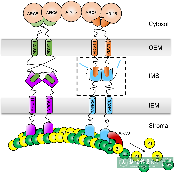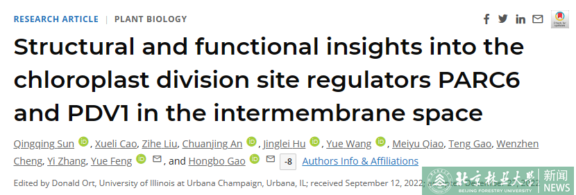 近日,生物學院高宏波教授團隊與北京化工大學馮越教授團隊合作在國際著名期刊PNAS上發表了題目為“Structural and functional insights into the chloroplast division site regulators PARC6 and PDV1 in the intermembrane space”的研究論文,對葉綠體分裂蛋白PARC6和PDV1互作以及相關的調控機制進行了深入研究。