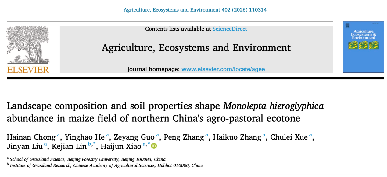 近日,草業(yè)與草原學(xué)院肖海軍教授團(tuán)隊(duì)在農(nóng)牧交錯(cuò)景觀調(diào)節(jié)害蟲(chóng)種群研究取得新進(jìn)展,相關(guān)成果以“Landscape composition and soil properties shape Monolepta hieroglyphica abundance in maize field of northern China's agro-pastoral ecotone”為題發(fā)表于《Agriculture, Ecosystems and Environment》。
