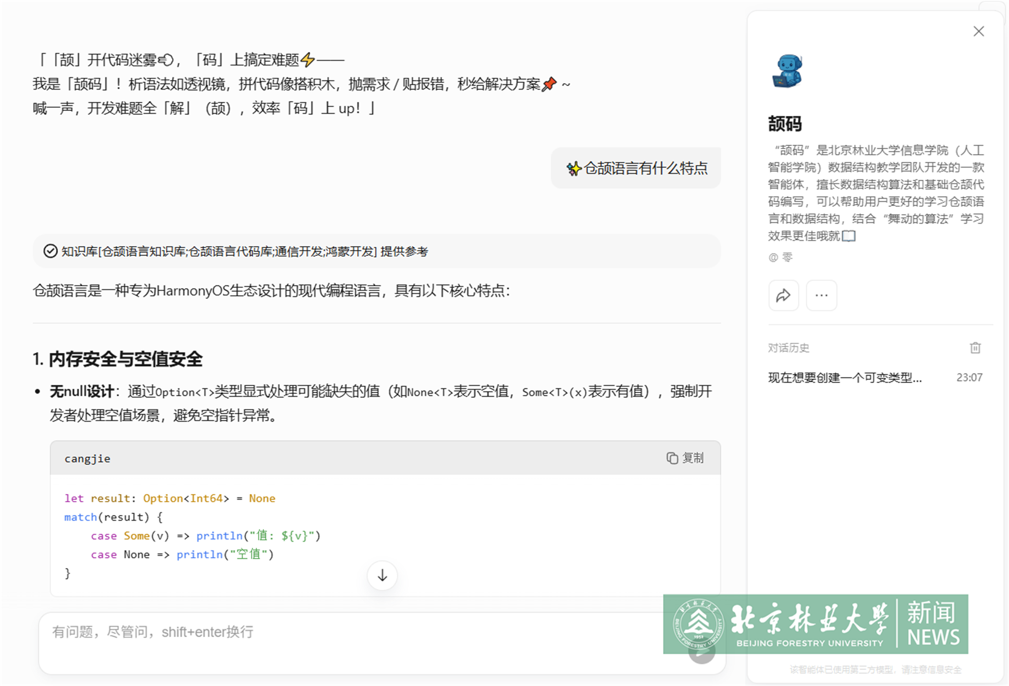 尤為突出的是,系統(tǒng)內(nèi)置了“算法小精靈”與“頡碼”兩大智能學(xué)習(xí)助手。其中,“算法小精靈”基于團(tuán)隊(duì)自建的專業(yè)知識(shí)庫,利用檢索增強(qiáng)生成(RAG)技術(shù),可秒級響應(yīng)數(shù)據(jù)結(jié)構(gòu)算法的深度答疑需求;“頡碼”則專注于倉頡語言代碼的輔助編寫與編程難題解答,為學(xué)習(xí)者提供了全天候、個(gè)性化的智能教學(xué)支持。