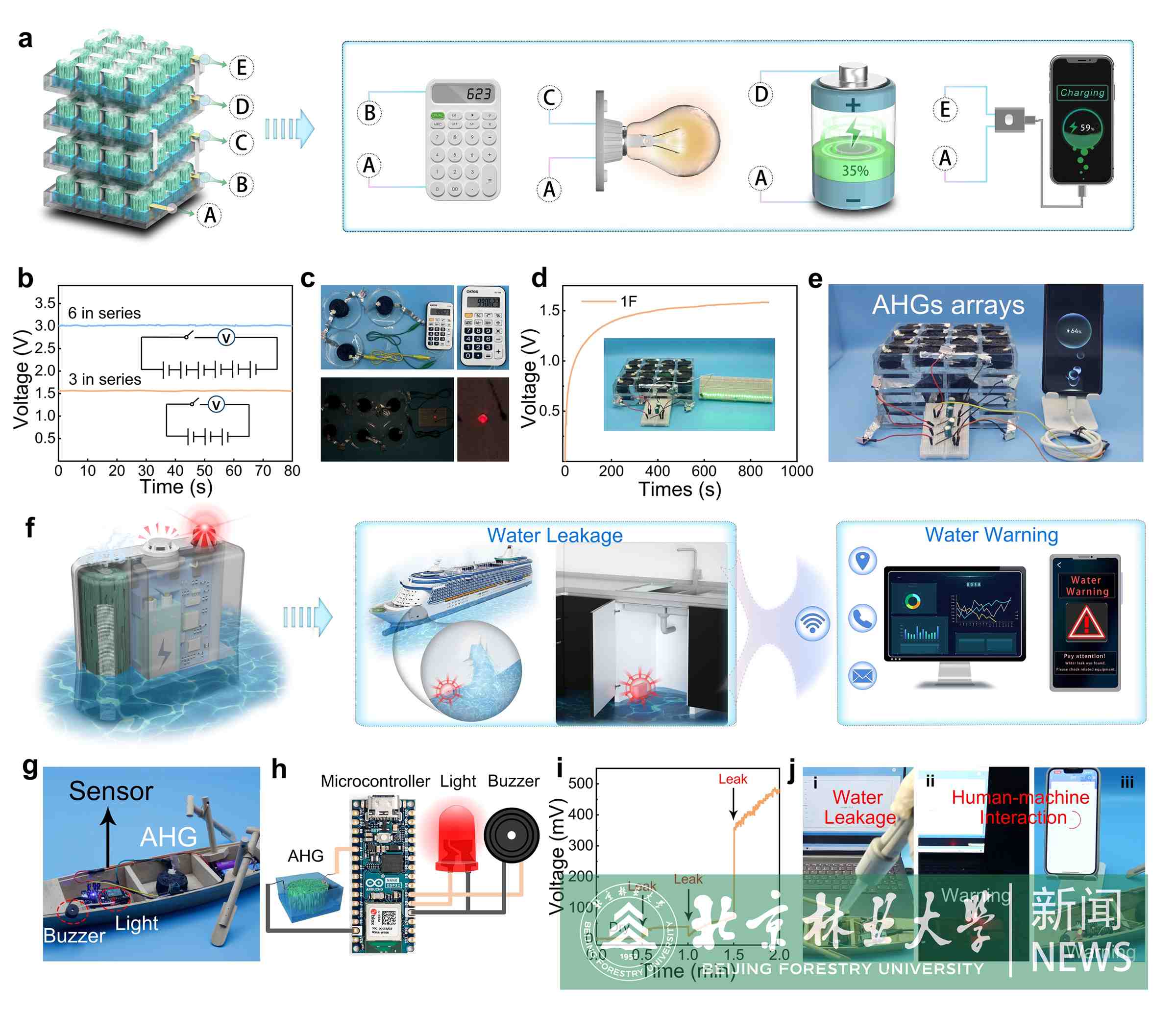 制備出的復合氣凝膠可在水中長期工作,輸出電壓和功率密度分別高達 697 mV, 0.57 μW cm-2,并且在鹽水中顯示出更高的輸出電壓(850 mV)和功率密度(3.82 μWcm-2)。此外,大規模集成的氣凝膠發電單元可以提供定制的電力輸出,為各種電子設備供電,并通過人機交互有效地檢測水泄漏。這項研究為納米纖維素復合多孔材料應用于水伏發電提供了一種可靠、高效的策略,并為自供電水傳感的發展提供了有力幫助。