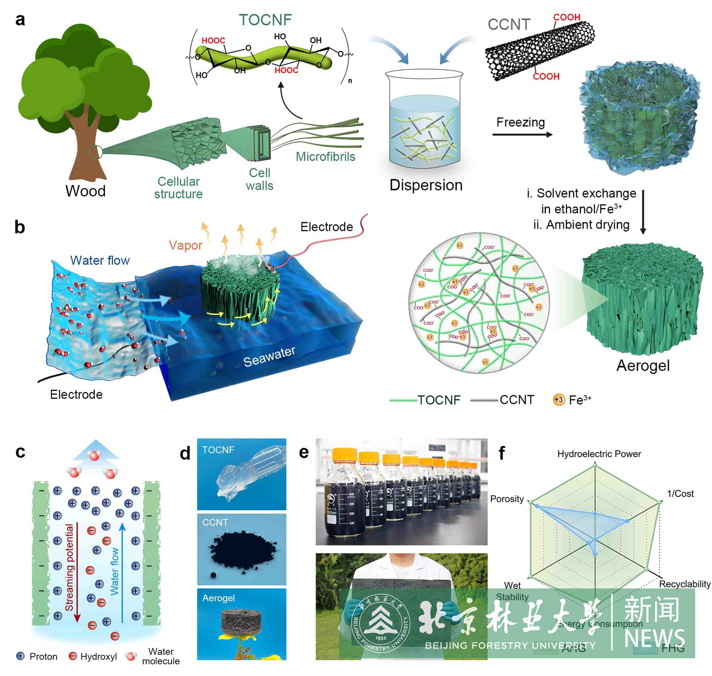 傳統的水力發電技術是將水能通過機械能間接轉化為電能,近年來新興的水伏發電技術可以從無處不在的水蒸發過程中直接獲取電能。利用可再生多孔氣凝膠開發水伏發電機可以促進其可持續性和發電性能,為綠色能源開辟廣闊的前景。然而,氣凝膠的傳統制備方法(如冷凍干燥和超臨界干燥)具有成本高、耗時、依賴特定設備等缺點,而且得到的氣凝膠往往具有較差的濕強度。在常壓條件下制備氣凝膠,需要表面/結構工程來強化氣凝膠結構,提高濕態穩定性的同時確保材料的完整性,以承受溶劑(水)蒸發產生的毛細力,從而克服干燥和工作過程中的結構坍塌問題。