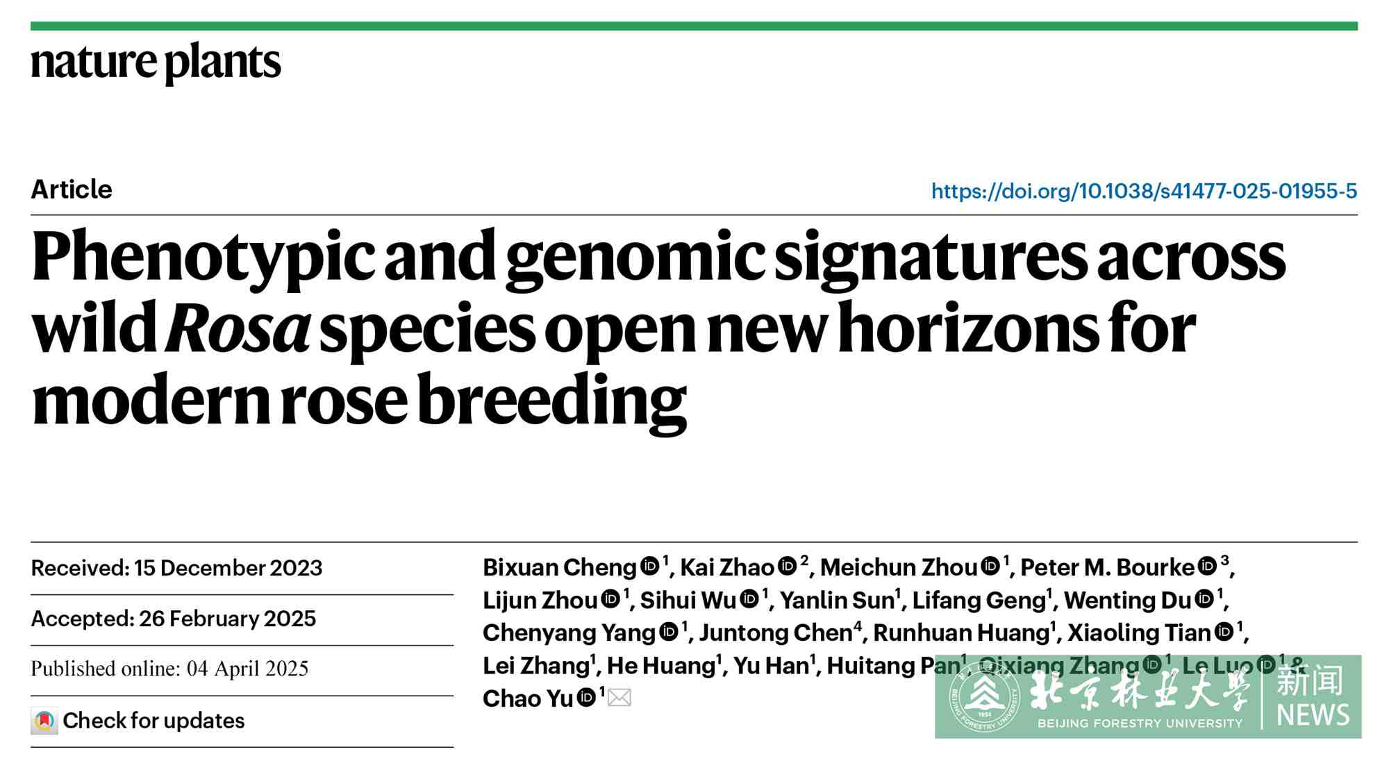 近日,園林學院研究團隊在植物學領域著名期刊Nature Plants發表題為《Phenotypic and genomic signatures across wild Rosa species open new horizons for modern rose breeding》的研究論文。該研究基于團隊多年的野生薔薇屬資源調查工作,系統還原了中國薔薇屬起源與演化歷史,鑒定了重要性狀馴化基因并篩選得到40余份優異新種質加入到現代月季育種基因庫中,為我國特色薔薇屬新品種創制提供了突破性理論支撐。