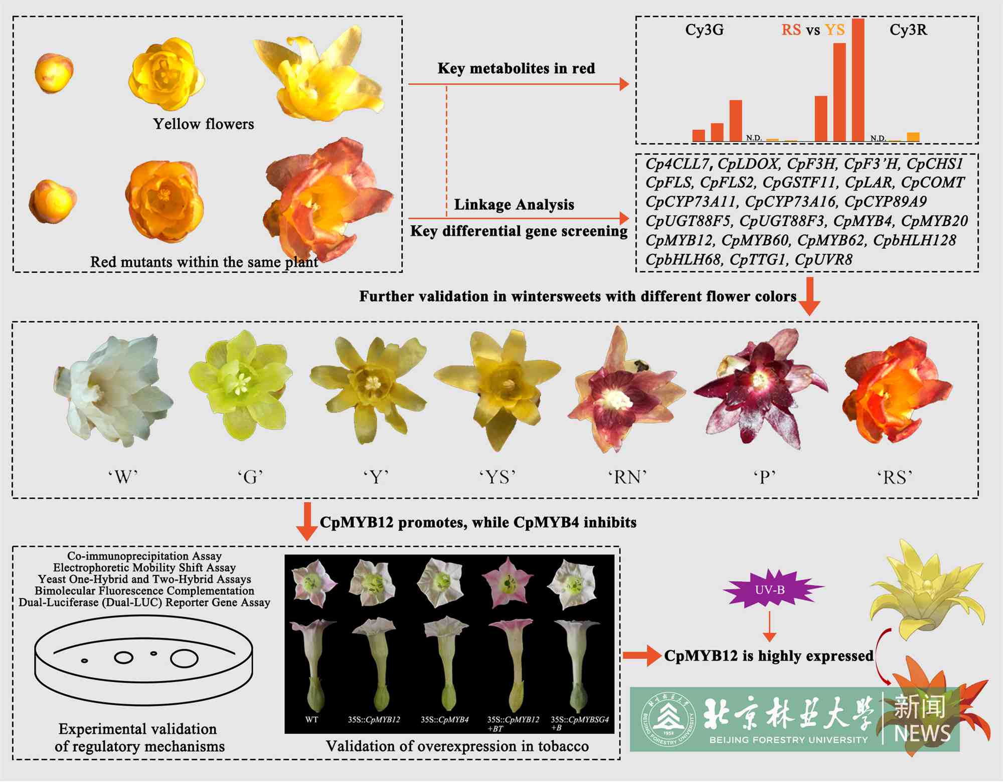 研究系統性揭示了色素代謝與基因表達之間的復雜映射關系:CpMYB12作為激活因子,通過與CpbHLH128和CpTTG1組建復合體,直接促進CHS、F3H、FLS與LDOX等關鍵基因的轉錄,從而驅動花色苷積累;而CpMYB4則作為拮抗因子,對同一通路實施抑制。進一步的跨物種功能驗證與UV-B誘導實驗表明,環境信號能夠通過調控CpMYB12的表達水平,觸發色素合成與花色加深。這一發現不僅闡明了蠟梅“由黃轉紅”的分子邏輯,也為觀賞植物花色改良與環境適應性研究提供了全新思路。