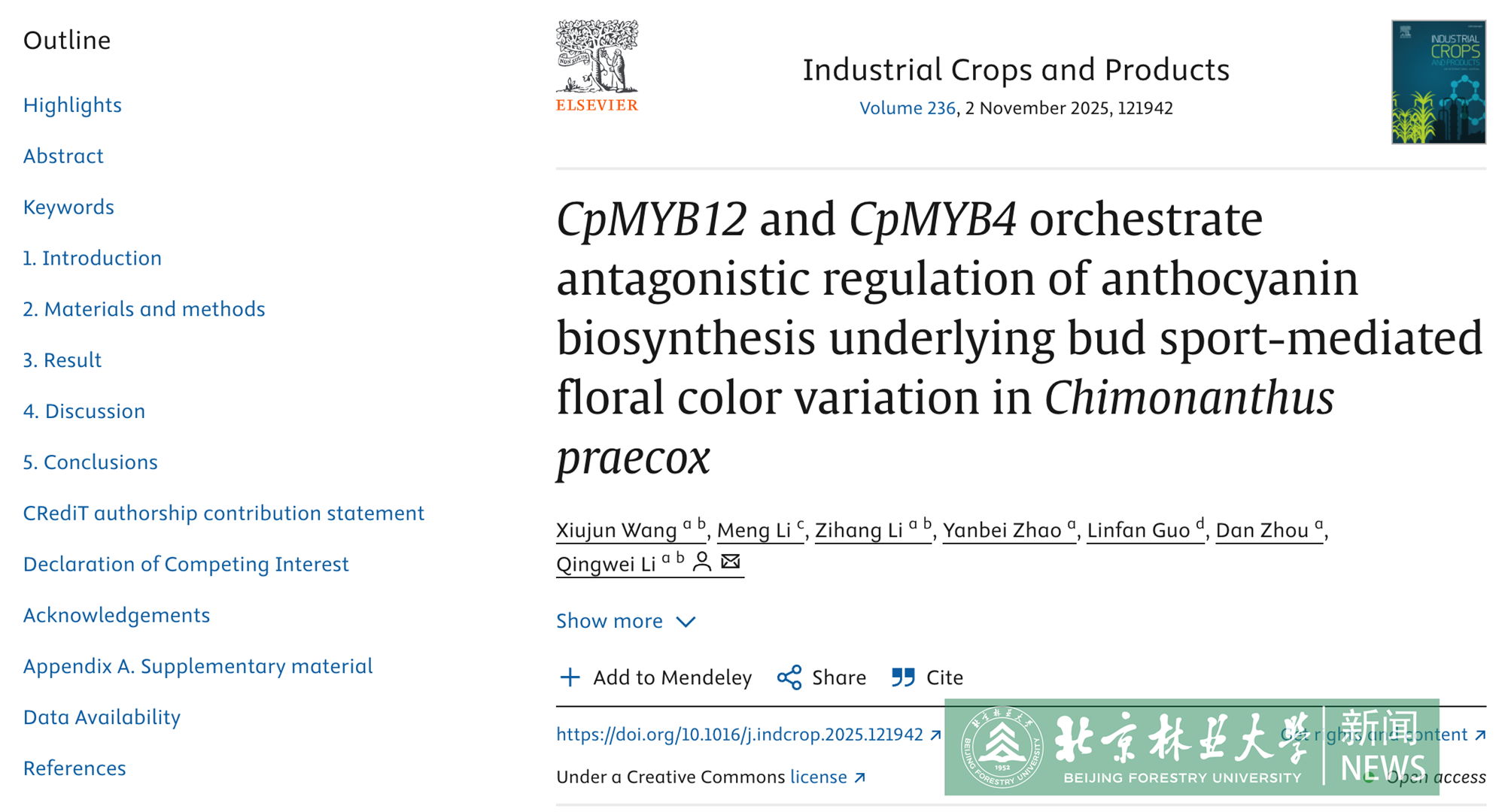 近日,園林學院李慶衛教授科研團隊在闡述蠟梅花色變化領域取得重要進展。研究成果以“CpMYB12 and CpMYB4 orchestrate antagonistic regulation of anthocyanin biosynthesis underlying bud sport-mediated floral color variation in Chimonanthus praecox”為題,在線發表于中國科學院一區TOP期刊Industrial Crops and Products。