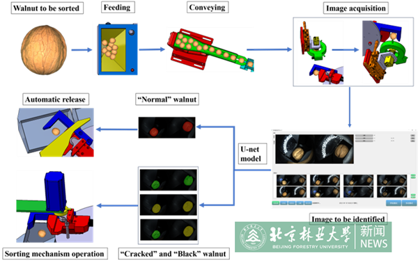 目前核桃產(chǎn)業(yè)中的品質(zhì)分選工序中仍采用人工觀察分選的工作方式,該方式勞動強度大,工作效率低,且易發(fā)生漏選情況。本研究以圖像語義分割算法為檢測方法,研制了一款基于機器視覺的外觀缺陷核桃自動清選機,具有良好的檢測精度與檢測效率。