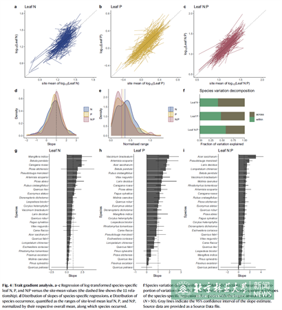 該研究表明,環境因素對驅動物種內葉片氮磷計量關系的可塑性具有不可忽略的影響,對生物地球化學生態位假說(Biogeochemical Niche Hypothesis)以及物種分布在塑造葉片氮磷計量全球格局的主導作用提出了挑戰。