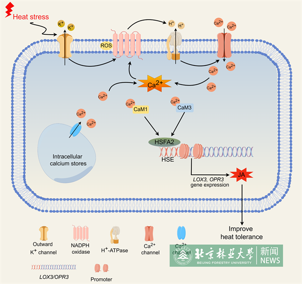 植物遭受熱脅迫時,首先被質膜外向K+通道感知,將細胞內的K+轉運至細胞外,進而激活質膜NADPH氧化酶RBOHD造成ROS的迸發,再激活質膜H+-ATPase通過消耗ATP將細胞質中的H+排出,引起質膜超極化激活內向鈣離子通道,為下游Ca2+流入胞質提供質子驅動力,[Ca2+]cyt的增加則由胞外Ca2+進入胞質和胞內Ca2+的動員和再分配共同完成,反過來,Ca2+也會調節ROS爆發,啟動下一輪早期信號事件。鈣信號作為第二信使,可與CAM1和CAM3結合并可能通過某種方式影響HSFA2基因的表達。HSFA2作為響應熱脅迫的關鍵轉錄因子,調控JA合成途徑關鍵酶LOX3、OPR3基因表達,促進JA的合成,降低植物的葉片相對電導率,提高相對含水量和葉綠素含量,從而增強擬南芥的耐熱性。
