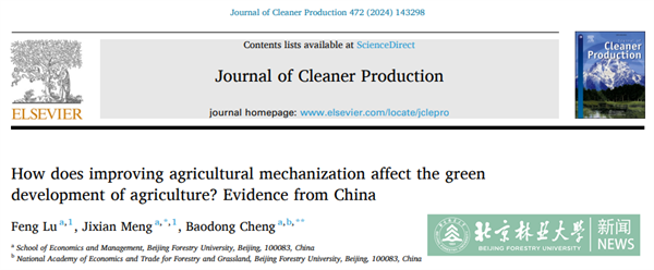 近日,北京林業大學國家林草經貿研究院程寶棟教授課題組在環境科學與生態領域1區TOP期刊Journal of Cleaner Production(SCI影響因子為9.7)在線發表最新研究成果《How does improving agricultural mechanization affect the green development of agriculture? Evidence from China》