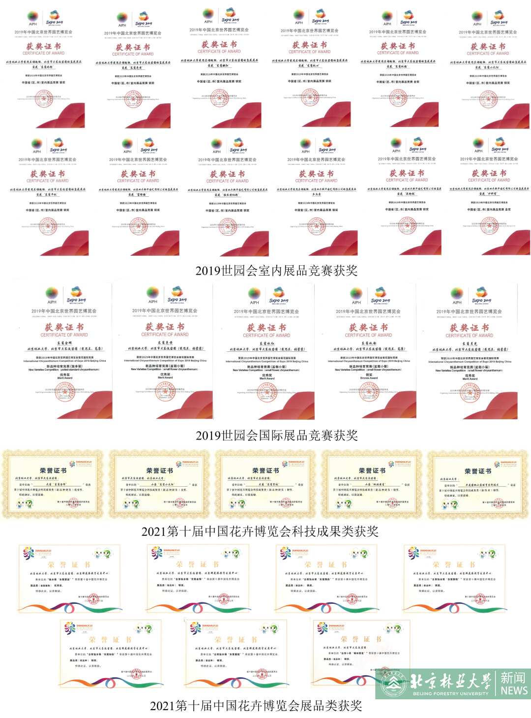 2019年,中國北京世界園藝博覽會在北京市延慶區舉行,在這次園藝領域的世界級盛會上舉辦了國際菊花競賽。北林也在這場全球菊花業的最高賽事上大放異彩。戴思蘭團隊選送了二十余個中國菊花品種參會,在國際菊花競賽,省(區、市)室內展品評比等活動中,榮獲各類獎項共19項。