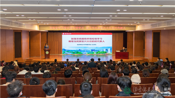 王洪元以學習貫徹黨的二十大精神為主線,帶領同學們系統學習了黨的二十大精神要義,全面回顧了過去十年黨和國家事業發展取得的歷史性成就、發生的歷史性變革。結合當前黨情國情世情校情,闡釋了國際國內的熱點問題,聚焦國家生態文明建設,講解了我校在服務國家建設中取得的跨越式發展。他與同學們共同分享了習近平總書記對青年的期望與寄語,強調同學們要堅定理想信念、聽黨話跟黨走,要珍惜大學時光、練就過硬本領,要厚植家國情懷、踐行使命擔當。勉勵同學們充分把握時代機遇,善于運用國家、社會和學校創造的良好學習條件,傳承弘揚“植綠報國”北林精神,立志做有理想、敢擔當、能吃苦、肯奮斗的新時代好青年,努力成長為堪當民族復興大任的時代新人。