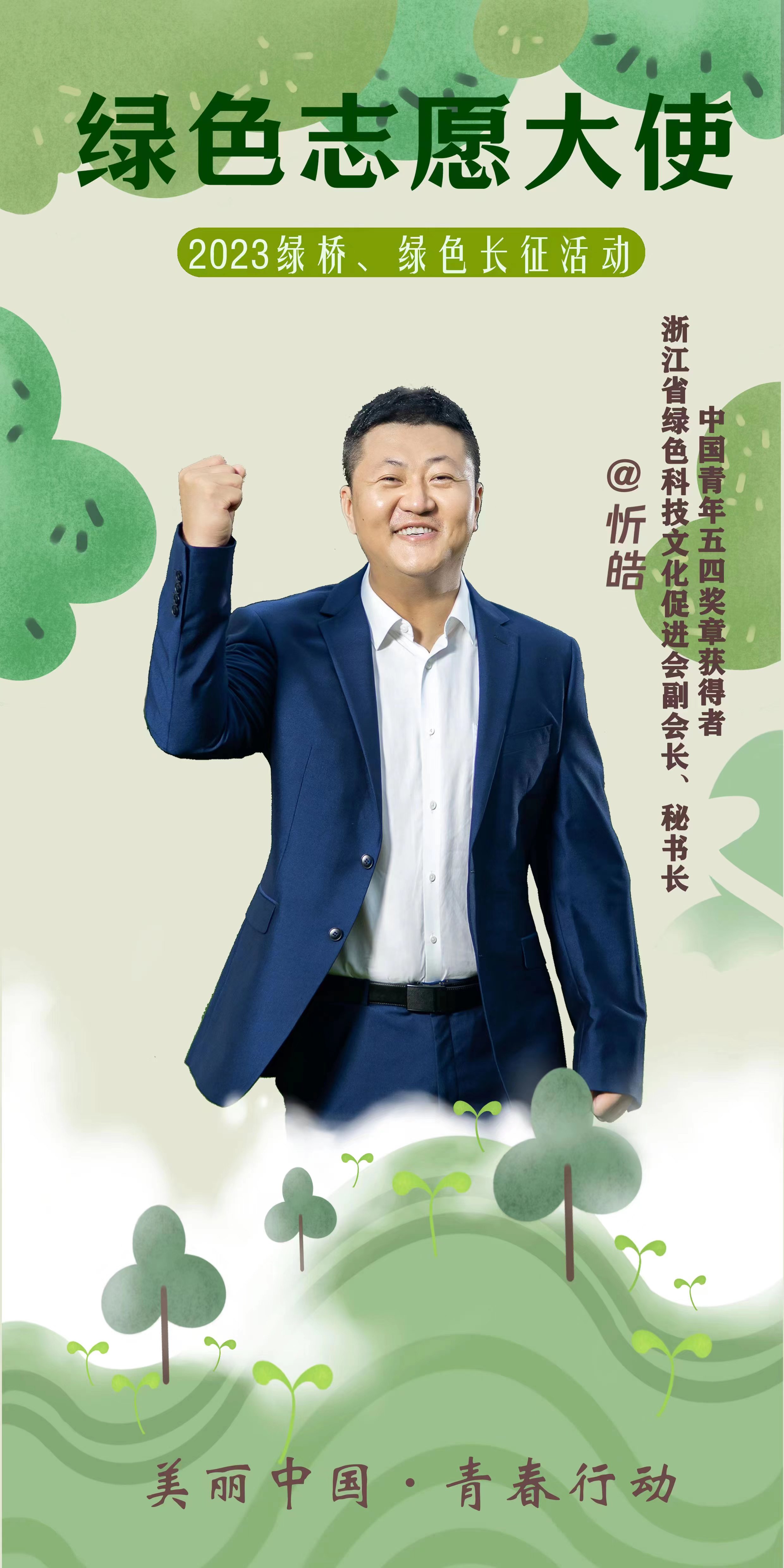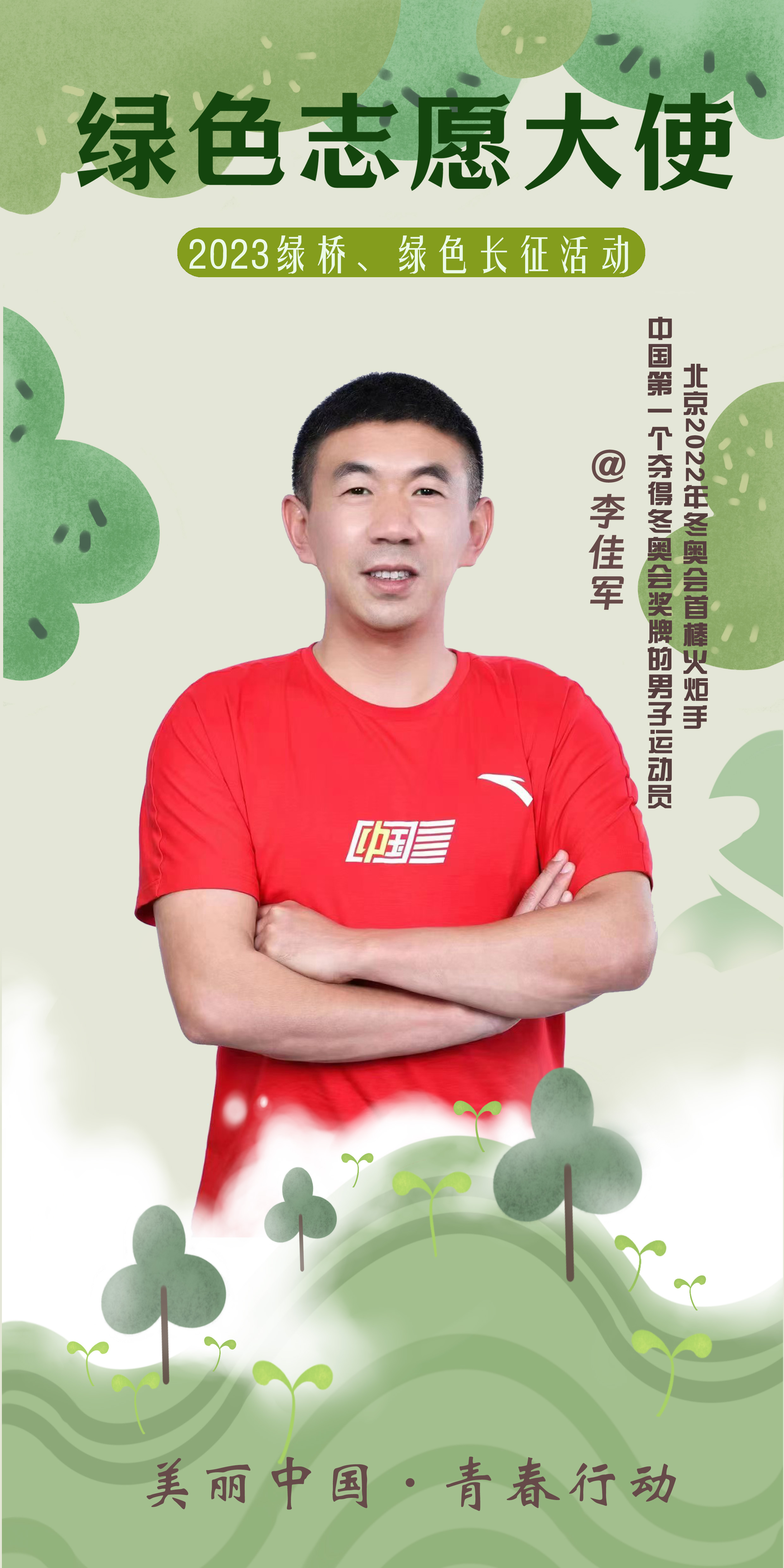 2023年綠橋、綠色長征活動聘請NPO綠色生命公益組織創始人兼理事長、第七屆中華慈善獎獲得者易解放,中國第一個奪得冬奧會獎牌的男子運動員、北京2022年冬奧會首棒火炬手李佳軍,演員、全國青聯常委佟大為,浙江省綠色科技文化促進會副會長、秘書長、中國青年五四獎章獲得者忻皓為新一屆“綠色志愿大使”。