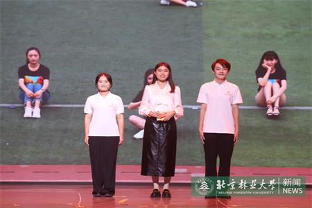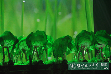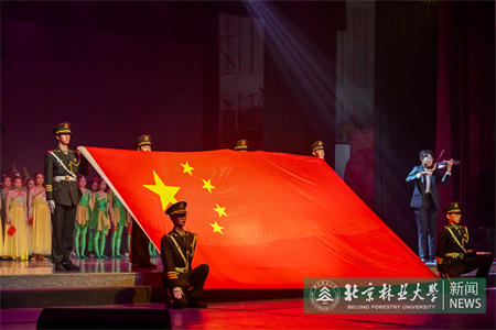 在下篇“挺膺·丹青筑夢”中,情景講述《樹·人》和師生演唱《好大一棵樹》中,師生代表娓娓道來,用歌聲點燃斗志,激勵新時代北林青年接續奮斗,為服務生態文明建設貢獻力量。舞臺劇《青春無畏》融合多樣表演,展現我校學生全面發展,百花齊放。原創舞蹈《苗涌》展現其樂融融的綠色家園與青年逐夢綠色的昂揚姿態。伴隨小提琴演奏《我和我的祖國》悠揚的旋律,國旗護衛隊邁著鏗鏘的步伐,護送國旗緩緩入場。歌舞演員們用最飽滿的熱情唱響《我們的新時代》。